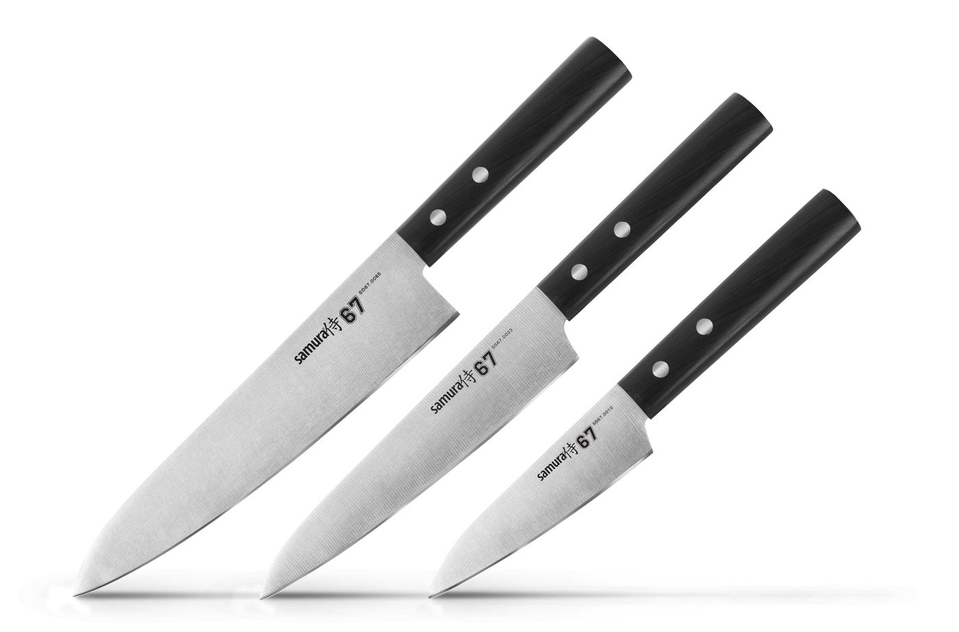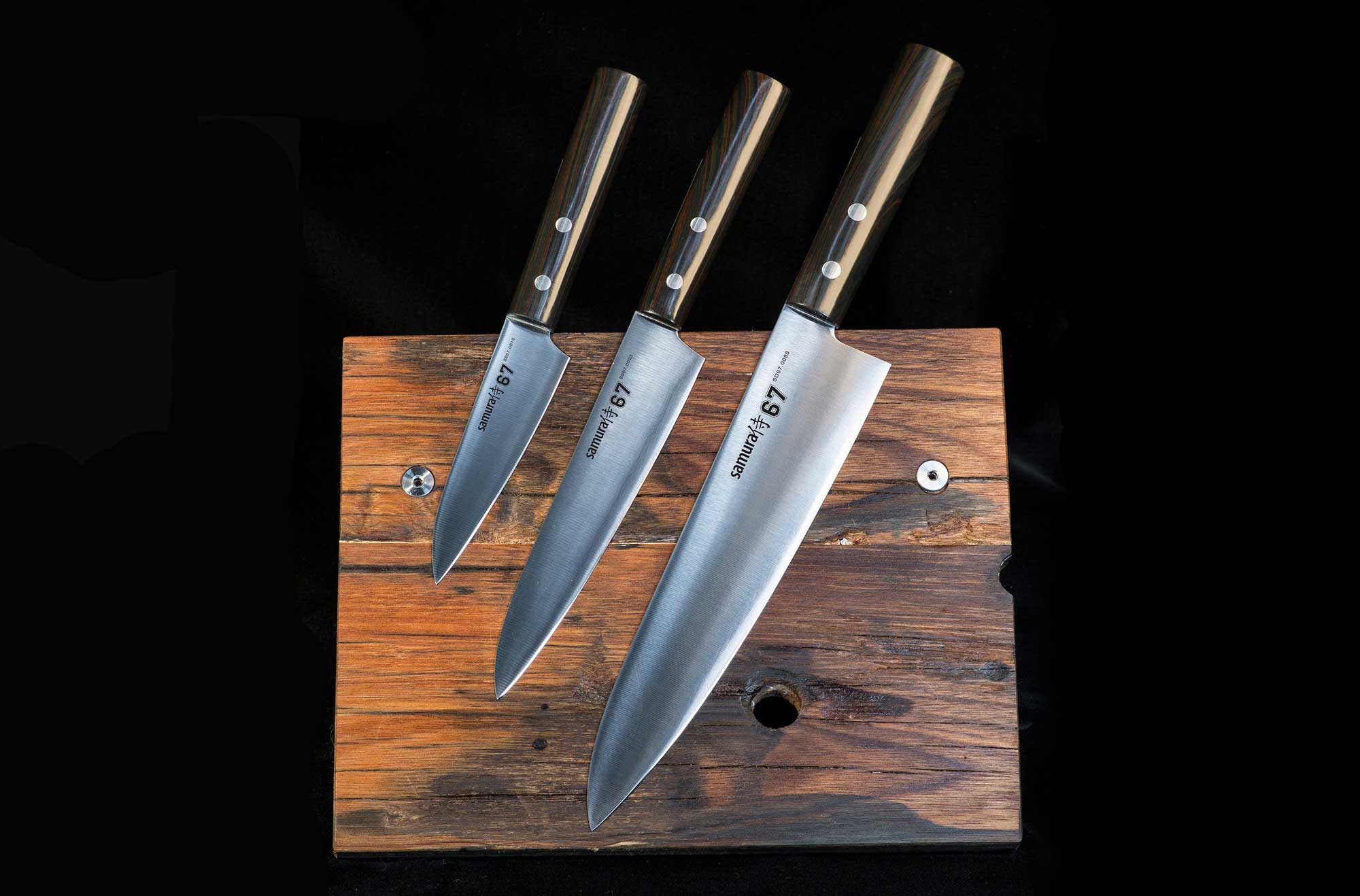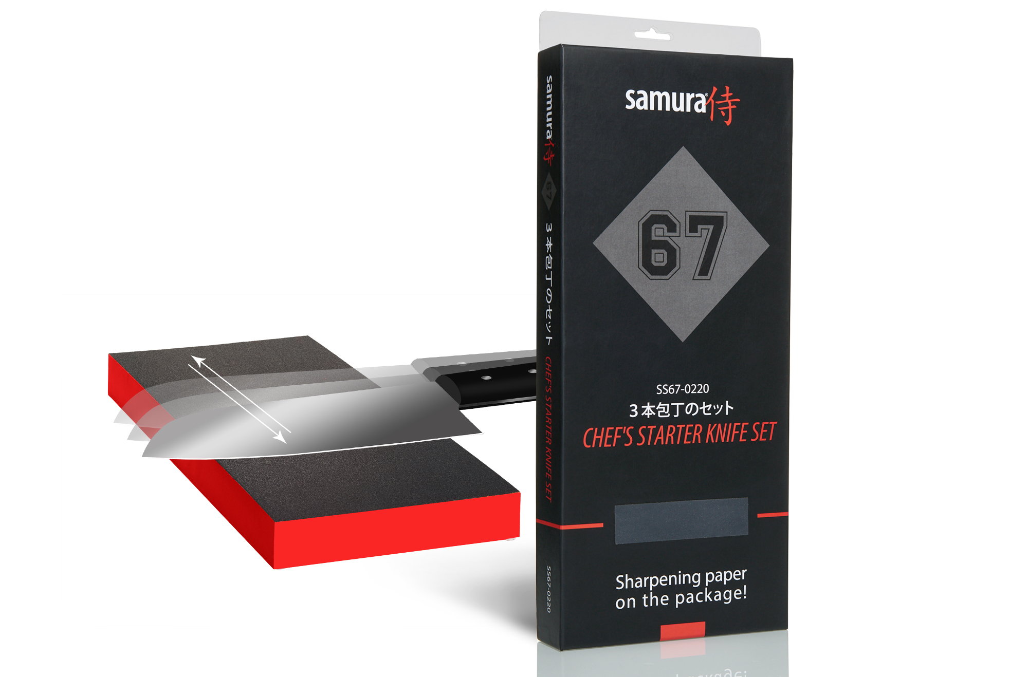 Charakteristickým znakem nožů z řady Samura 67 je balení společně s brusným papírem, jehož pomocí lze nože kdykoli snadno přibrousit.