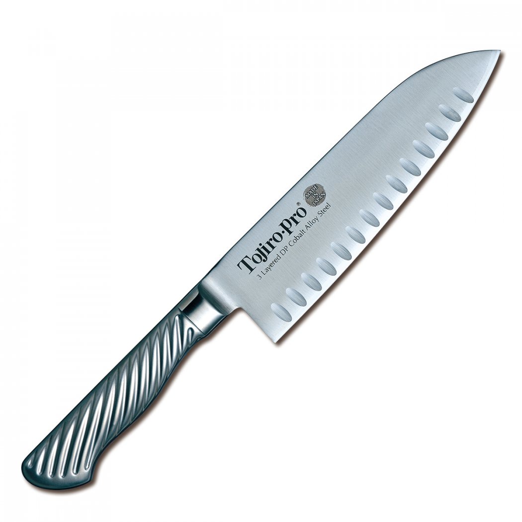 Santoku je univerzální nůž vhodný pro práci se zeleninou, masem a rybami. Tenké ostří nože Vám zaručí hladký a snadný řez, díky kterému z krájené zeleniny nebo masa neunikne zbytečně šťáva. Duté vroubkování brání ulpívání krájené suroviny na čepeli, je proto také vhodný pro krájení sýrů nebo lososa.